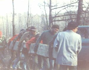 we could move onto the place, that being the So, in early January, with the advice of a log builder, Robin Garrett, and the help of a friend, Jack "Mr. Barbecue" Brooks, Annie and I started tearing down the building bit by bit in order to get to the logs, number them, haul them to the land, and rebuild the cabin. Fortunately, the Blurs had very little booked in January. This was in fact a rarity, as we often did Midwest tours then. We might have run out to do the Chicago Folk Festival. I can't recall. At any rate, by the end of January we got the logs moved and there were tidy piles of plastic covered logs sitting around the house site. We had the help, on moving day, of the band and most of our local fans I think, but it happened. Then we did go on tour, and it snowed. In February, towards the end of the
