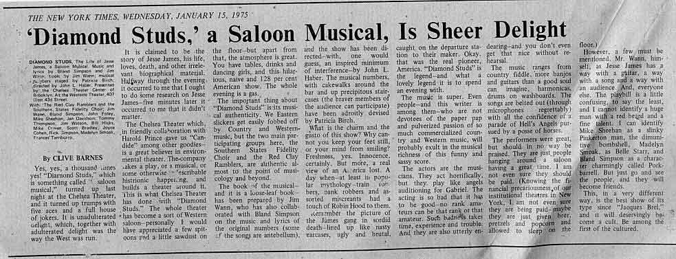 ‘Diamond Studs,’ a Saloon Musical, Is Sheer Delight DIAMOND STUDS, The Life of Jesse James, a Saloon Musical. Music and lyrics by Bland Simpson and Jim Wann; book by Jim Wann; musical numbers staged by Patricia Birch; directed by John L. Haber. Presented by the Chelsea Theater Center of Brooklyn. At the Westside Theater, 407 West 43d Street. Yes, yes, a thousand times yes! “Diamond Studs,” which is something called “a saloon musical,” turned up last night at the Chelsea Theater, and it turned up trumps with five aces and a full house of jokers. It is unadulterated delight, which, together with adulterated delight, was the way the West was run. It is claimed to be the story of Jesse James, his life, loves, death, and other irrelevant biographical material. Halfway through the evening, it occurred to me that I ought to do some research on Jesse James—five minutes later it occurred to me that it didn’t matter. The Chelsea Theater which, in friendly collaboration with Harold Prince gave us “Candide” among other goodies—is a great believer in environmental theater. The company takes a play, or a musical, or some otherwise indescribable histrionic happening, and builds a theater around it. This is what Chelsea Theater has done with “Diamond Studs.” The whole theater has become a sort of Western saloon—personally I would have appreciated a few spittoons and a little sawdust on the floor—but apart from that, the atmosphere is great. You have tables, drinks, and dancing girls, and this hilarious, naïve and 128 per cent American show. The whole evening is a gas. The important thing about “Diamond Studs” is its musical authenticity. We Eastern slickers get easily fobbed off by Country and Western music, but the two main participating groups here, the Southern States Fidelity Choir and the Red Clay Ramblers, are authentic almost to the point of musicology and beyond. The book of the musical—and it is a loose-leaf book—has been prepared by Jim Wann, who has also collaborated with Bland Simpson on the music and lyrics of the original numbers (some of the songs are antebellum), and the show has been directed—with, one would guess, an inspired minimum of interference—by John L Haber. The musical numbers, with cakewalks around the bar and up precipitous staircases (the braver members of the audience can participate) have been adroitly devised by Patricia Birch. What is the charm and the gusto of this show? Why cannot you keep your feet still, or your mind from smiling? Freshness, yes. Innocence, certainly. But more, a real view of an America lost. A day when—at least in popular mythology—train robbers, bank robbers, and assorted miscreants had a touch of Robin Hood to them. Remember the picture of the James gang in sordid death—lined up like nasty carcasses, ugly and brutal, caught on the departure station to their maker. Okay, that was the real pioneer, America. “Diamond Studs” is the legend—and what a lovely legend it is to spend an evening with. The music is super. Even people—and this writer is among them—who are not devotees of the paper pap and pulverized passion of so much commercialized country and Western music, will probably exult in the musical richness of this funny and sassy score. The actors are the musicians. The act horrifically, but they play like angels auditioning for Gabriel. The acting is so bad that it has to be good—no rank amateurs can be that rank or that amateur. Such badness takes time, experience and trouble. And they are so utterly endearing—and you don’t even get that nice without rehearsal. The music ranges from country fiddle, more banjos and guitars than a good soul can imagine, harmonicas, drums on washboards. The songs are belted out (through microphones regrettably) with all the confidence of a parade of Hell’s Angels pursued by a posse of horses. The performers were great, but should in no way be praised. They are just people hanging around a saloon having a great time. I am not even sure they should be paid. (Knowing the financial precariousness of our institutional theatres in New York, I am not even sure they are being paid—maybe they are just given beer, pretzels and popcorn and allowed to sleep on the floor.) However, a few must be mentioned. Mr Wann, himself, as Jesse James has a way with a guitar, a way with a song and a way with an audience. And, everyone else. The playbill is a little confusing, to say the least, and I cannot identify a huge man with a red beard and a fine talent. I can identify Mike Sheehan as a slinky Pinkerton man, the diminutive bombshell, Madelyn Smoak, as Belle Starr, and Bland Simpson as a character charmingly called Porkbarrell. But just go and see the people, and they will become friends. This, in a very different way, is