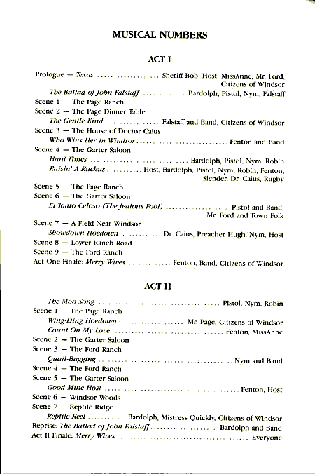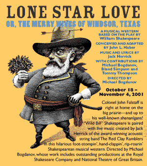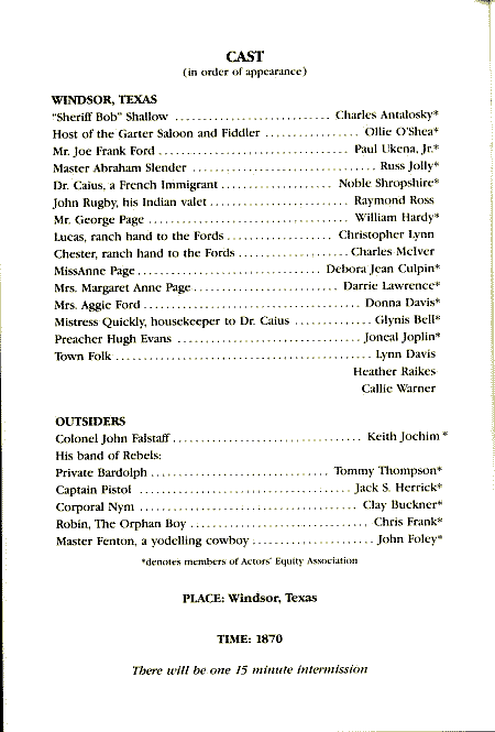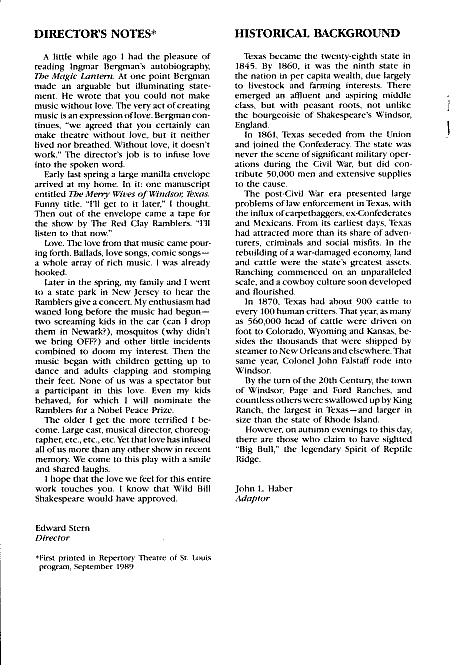 Members of the Red Clay Ramblers and John Haber first presented The Merry Wives of Windsor, Texas in the early '70s. The latest production was at the Great Lakes Theater Festival in Cleveland, Ohio, in the fall of 2001, and was dedicated to Tommy Thompson. The name expanded to Lone Star Love, or The Merry Wives of Windsor, Texas in recent productions. R. J. Reynolds Industries Theater, Bryan Center Duke University, Durham, NC December 7-23, 1989 (click on the thumbnails for a larger view) ![]()