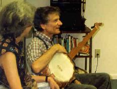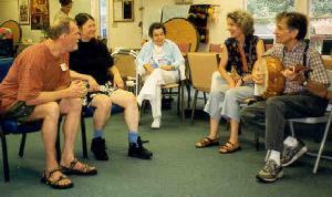 | Mike Seeger visits Tommy at Charles House in 1998. Cece Conway is on Tommy's left. |