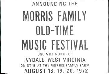 "Morris Family Old Time Music Festival" order from Omni Productions Box 5130 Charleston, WV 25361 omni@ntelos.net 30 minutes, black and white, VHS from the original 16 mm film Institutional copies $150, individual copies for personal use $25 ppd. Special Collectors edition add $5, priority mail add $5 |