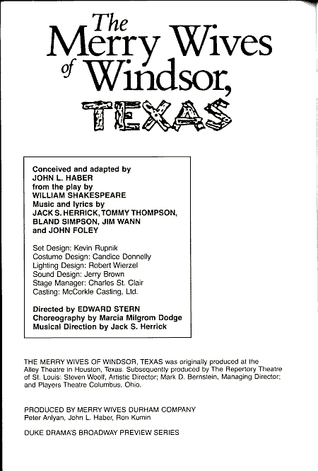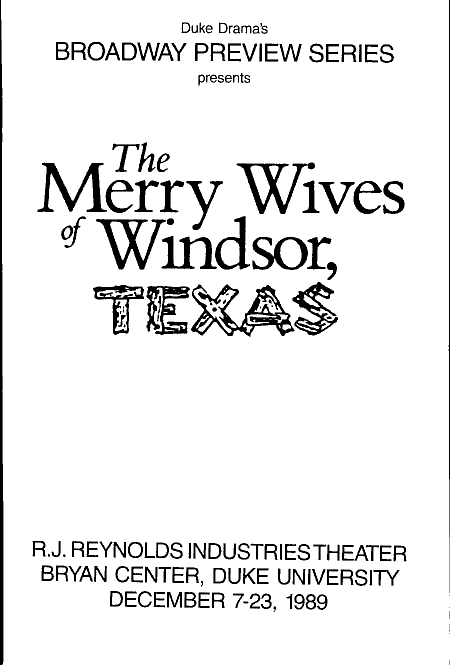 1989 program for The Merry Wives of Windsor, Texas (From the collection of Roy C. Dicks) This play was first staged in 1972 and reached Off-Broadway in 2004. |