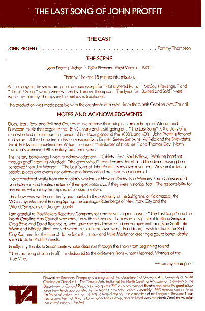 The Last Song of John Proffit 1984 Tommy Thompson's one-act play (From the collection of Roy C. Dicks) John Proffit page |