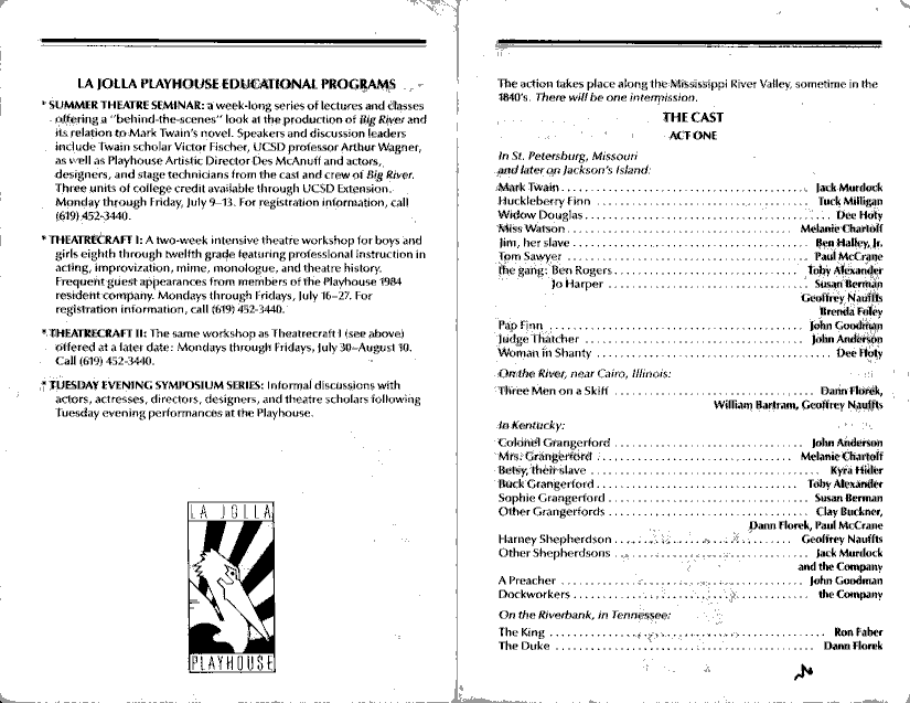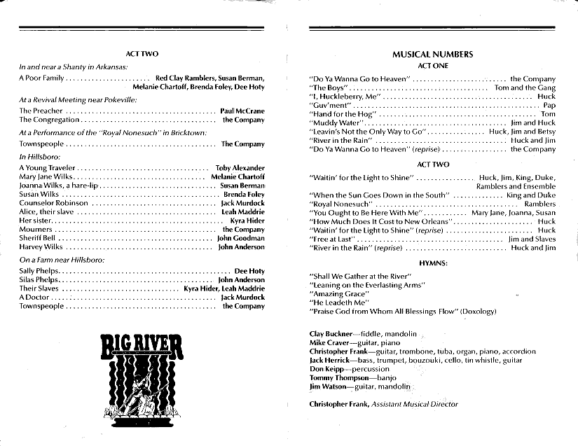 Big River, La Jolla Playhouse, summer of l984 Directed by Dez MacAnuff (he directed Tommy on Broadway) - more on Big River and RCR theater |