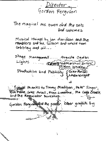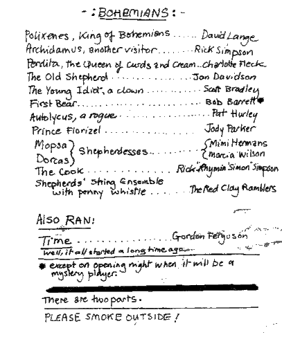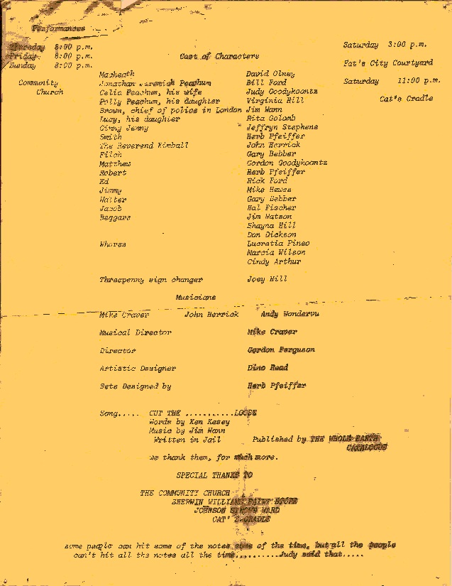 Three Penny Opera l972 Mike Craver and Jack "John" Herrick work together for the first time. You will note familiar names, Dave Olney and Jim Wann. The Jim Watson in this one is not our Jim Watson, but another. |